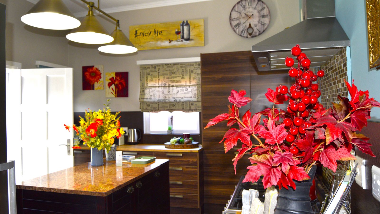 The Main Residence welcomes you with a grand entrance hall that sets the tone for its refined character. Rich wooden floors flow throughout, complementing the sophisticated formal dining room and a spacious living area adorned with a striking chandelier/pendant light.