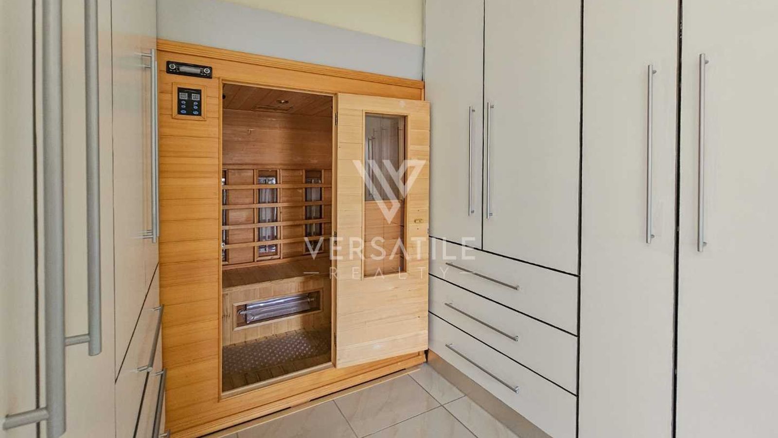 The first floor houses the main bedroom which has a study area, ensuite bathroom, walk in closet, infra-red sauna and opens up to a large balcony with partial sea views.
