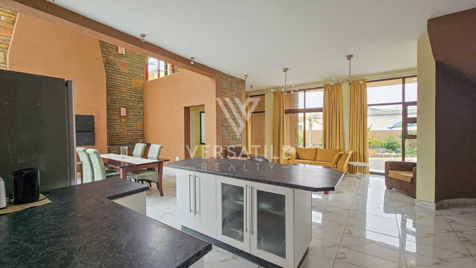 • Open-plan kitchen, lounge, and dining area.