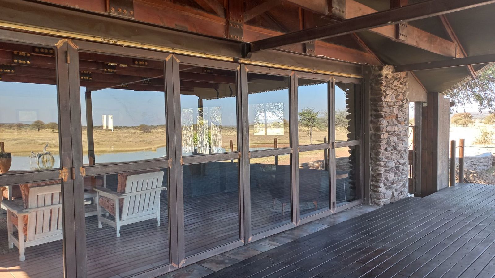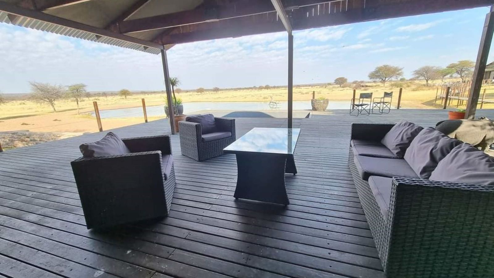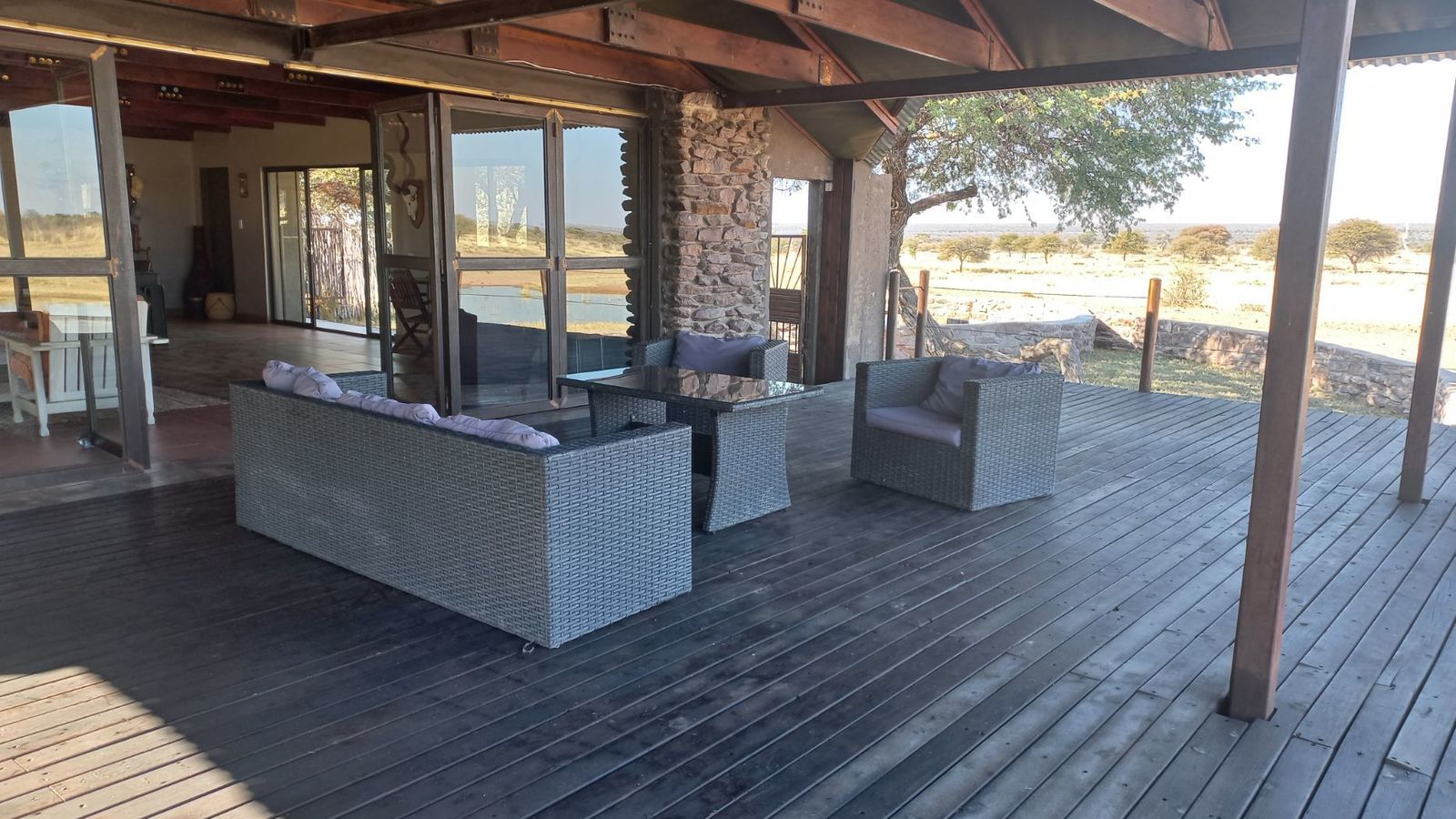 Large outside deck with fireplace and a gorgeous view over a water-hole.