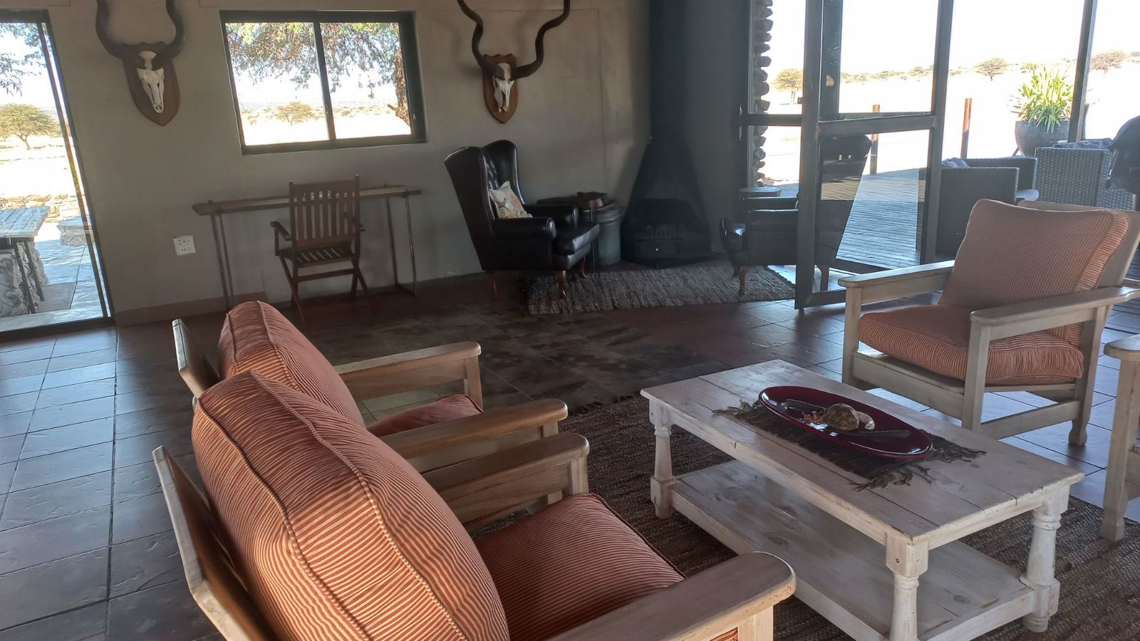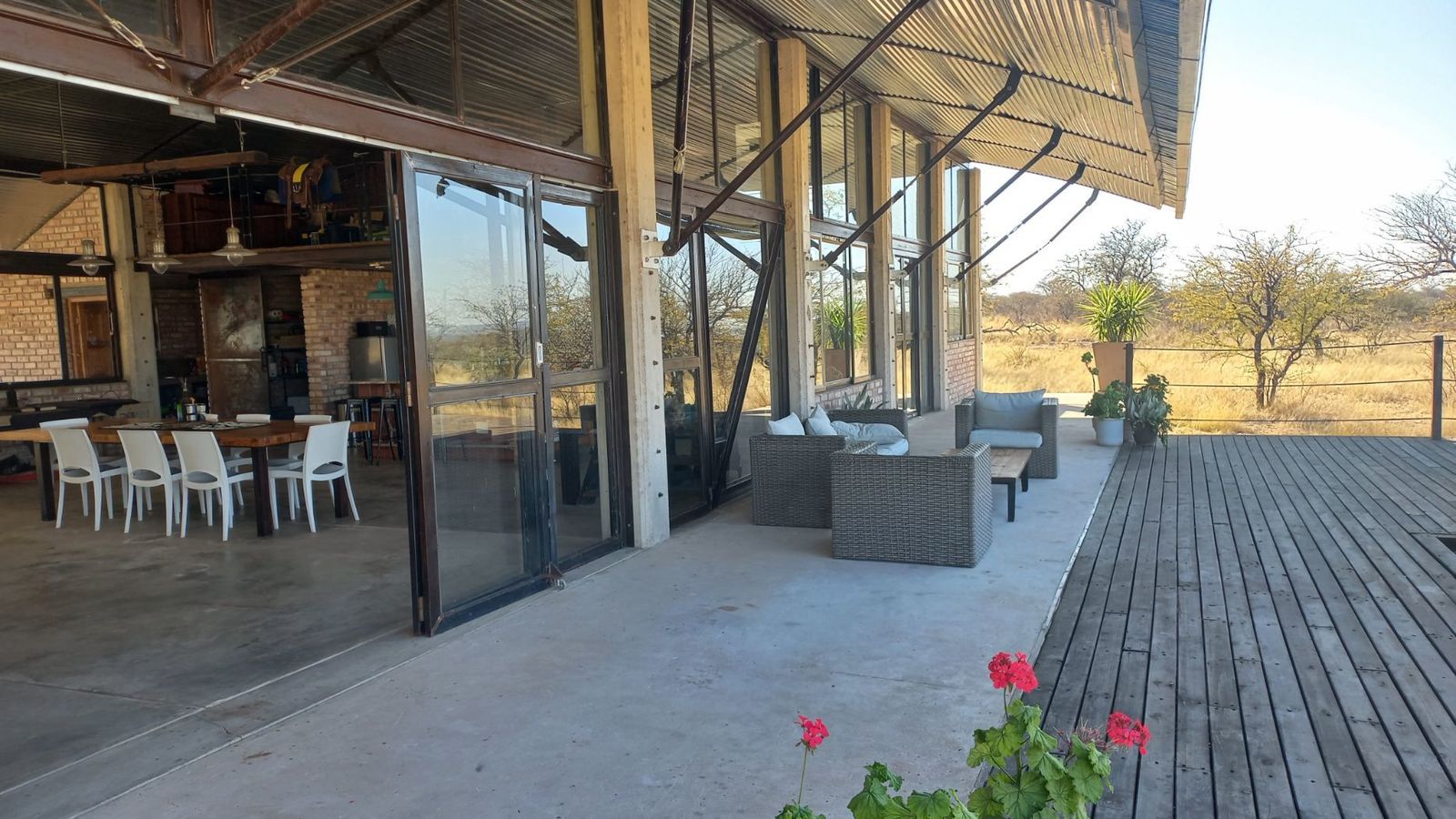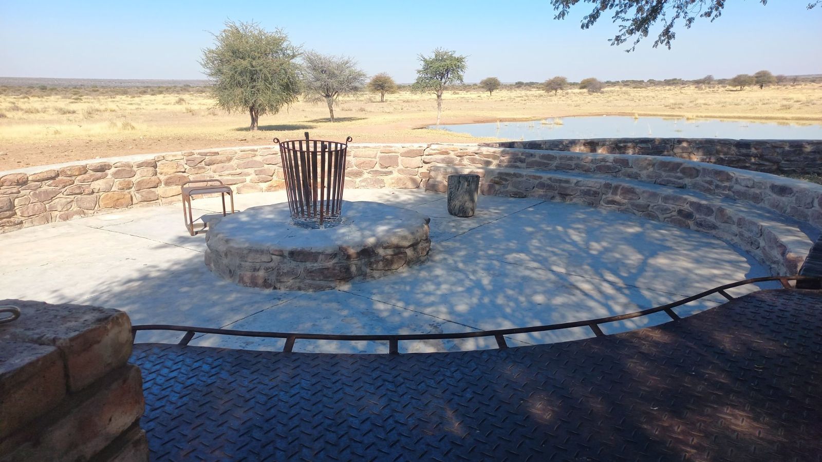 Large outside deck with fireplace and a gorgeous view over a water-hole.
