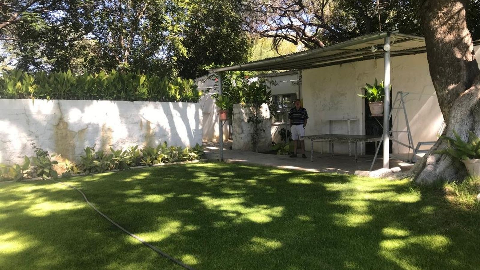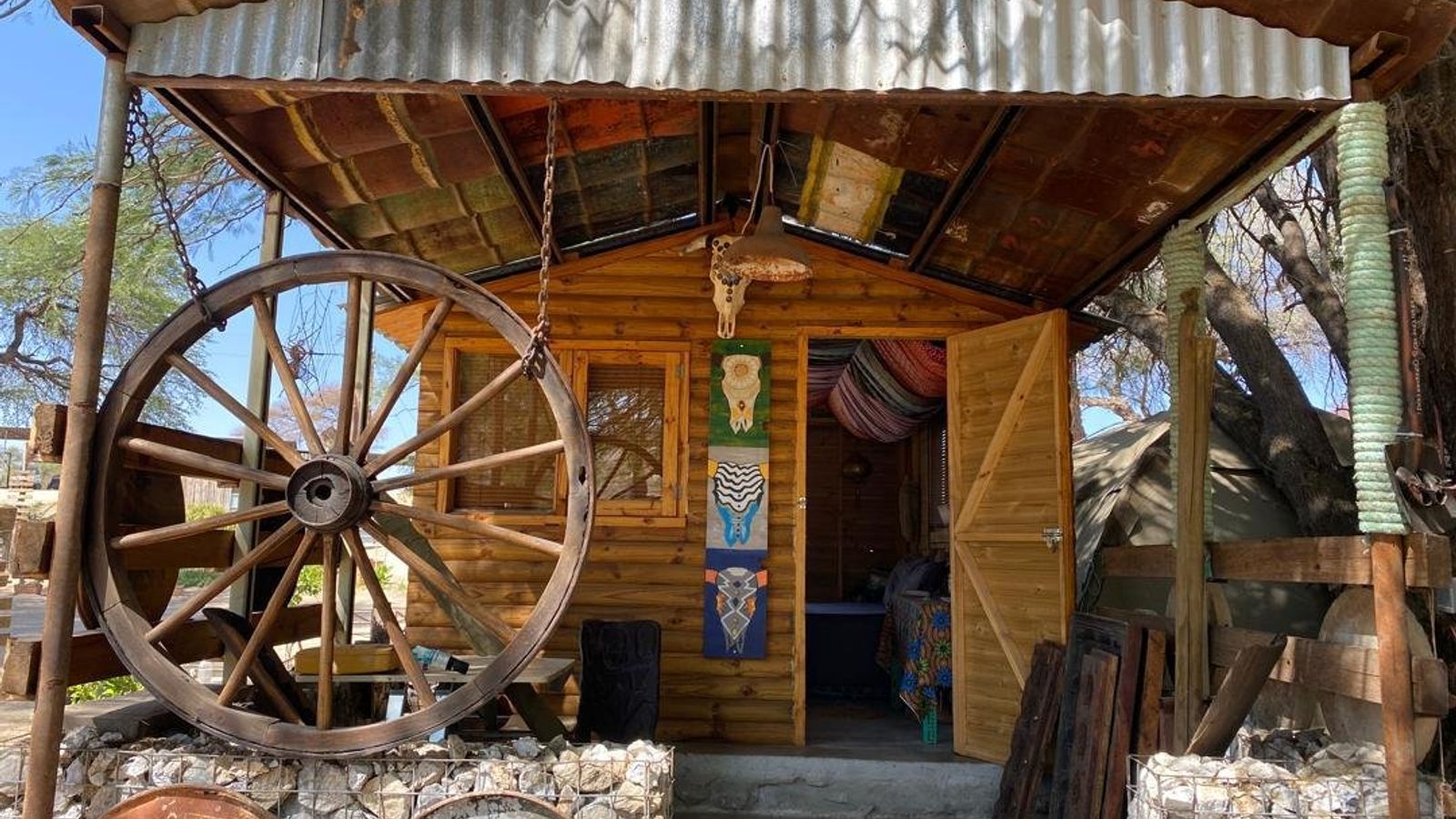 Comfortable farmhouse featuring a bedroom, bathroom, lounge, kitchen, and a stoep overlooking the surrounding landscape.