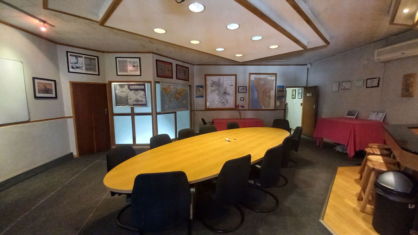 A two-story office building spanning 385 sqm features a welcoming reception area, multiple offices, a boardroom, and an outdoor entertainment space—ideal for accommodating staff and clients alike.