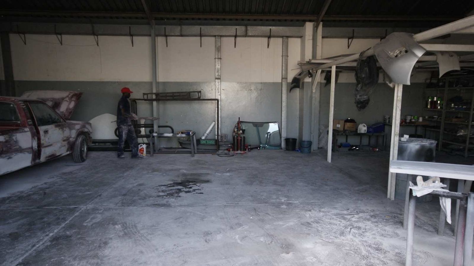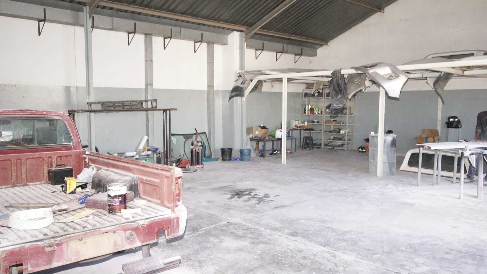 Structure: Brick walls under iron roof with roller door