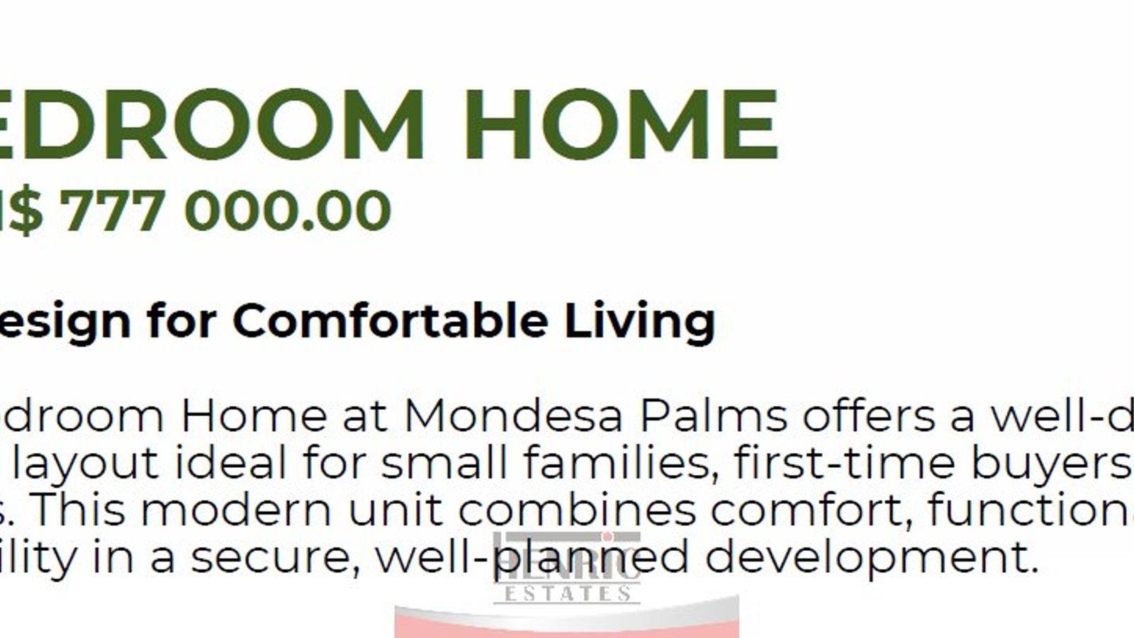 To secure your new home at Mondesa Palms, a non-refundable deposit of N$ 2,000.00 is required.