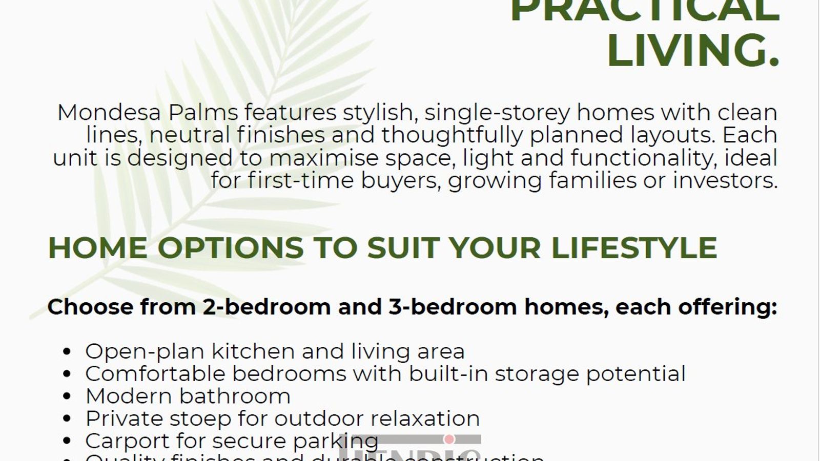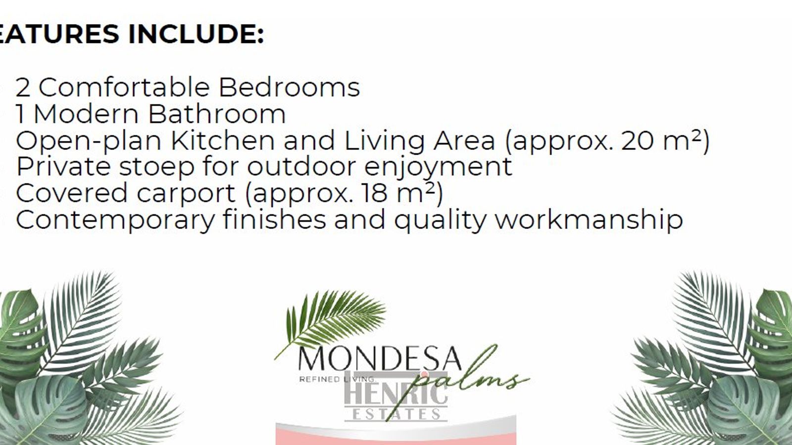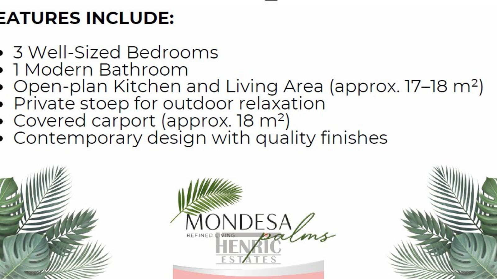 Mondesa Palms offers a selection of meticulously crafted 2-bedroom and 3-bedroom homes, each featuring:
