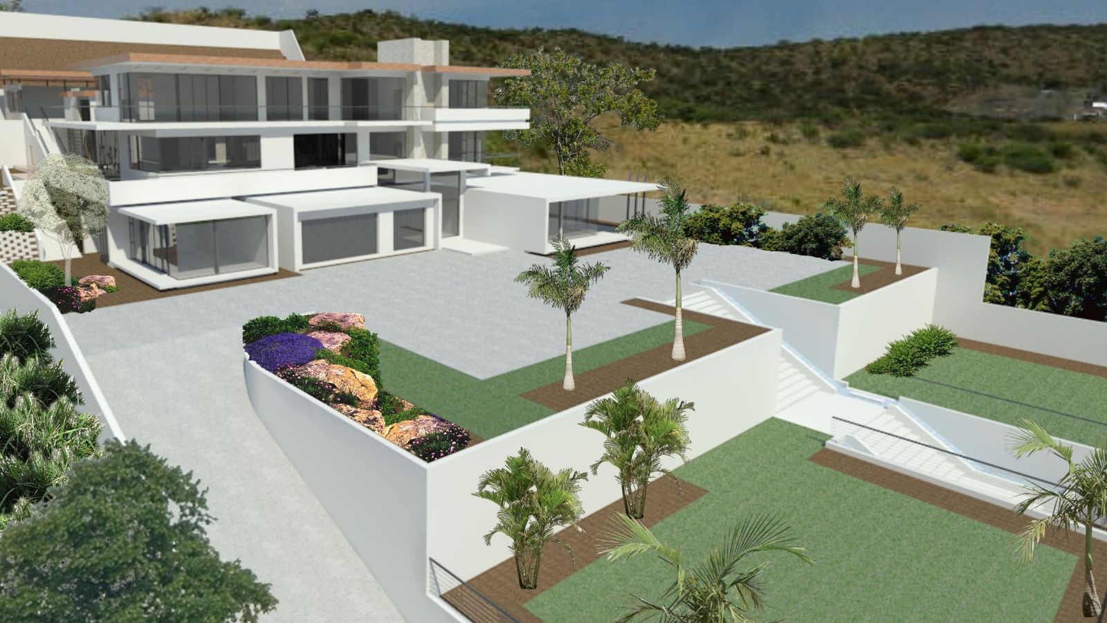 The design features multiple levels, expansive glass façades, generous entertainment terraces, and landscaped outdoor spaces, creating a seamless flow between indoor and outdoor living.